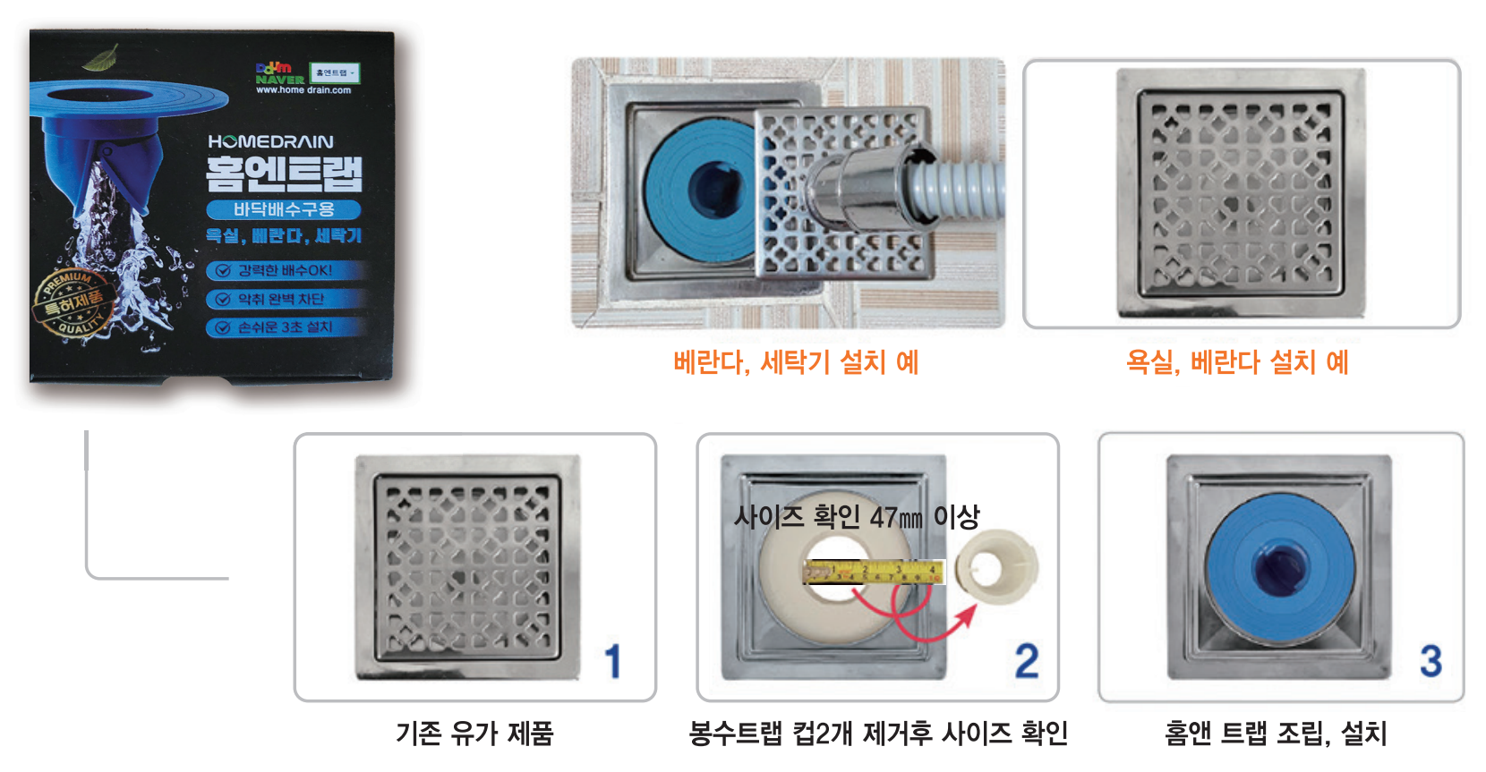 파란색 (바닥용트랩) : 욕실, 베란다, 다용도, 세탁기 공용 주황색 (배관용트랩) : 씽크대. 세면대, 세탁기 공용 |