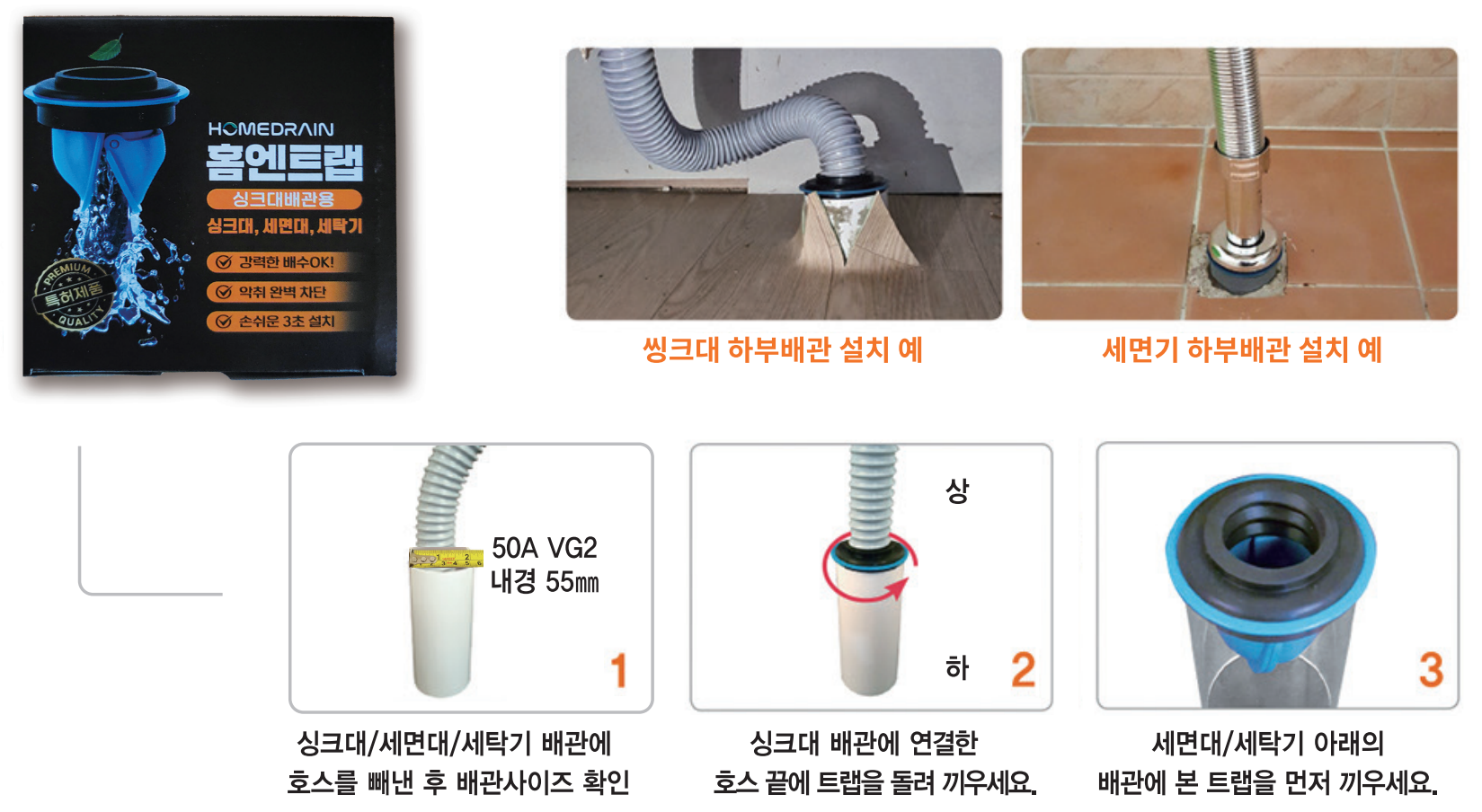 파란색 바닥구경 크기 : 47mm ~ 100mm (기타 별도문의) 주황색 배관크기 : 50A VG2(내경 55mm), VG1(내경 51mm) |