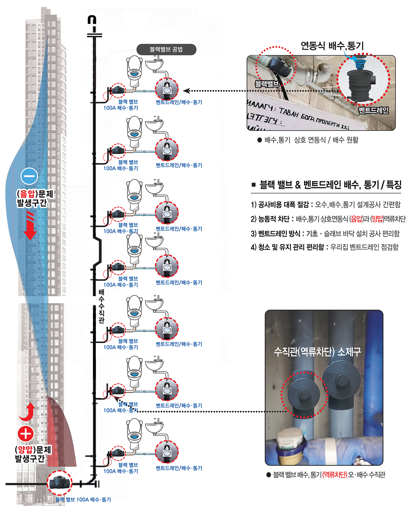 - 블랙 밸브 & 벤트드레인 시스템은 2개의 배수관 또는 1개의 배수관으로 선택, 변기, 세면기, 욕실바닥, 배수, 통기하여 음압과 양압의 문제점을 설계 및 공사하여 냄새, 해충, 역류 등을 해결합니다.