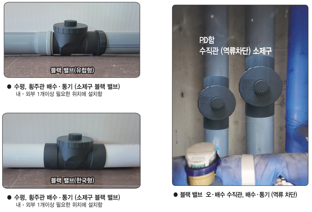 - ● 블랙 밸브 75A, 100A 수평관 또는 수직관 (역류차단) / 오▪배수관에 1개이상 편리한 위치에 셜계 및 설치한다.