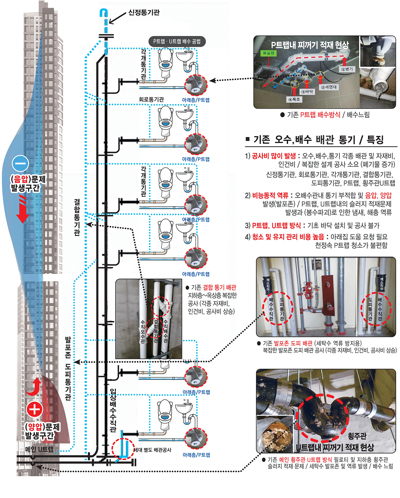 - 기존의 복잡한 배수와 통기시스템은 설계 또는 공사가 부적합할경우 공기 통기 부족과 배수의 흐름이 원활하지 않으며, 각종 사이펀과 음압, 양압의 봉수파괴로 인한 냄새, 해충이 역류합니다.