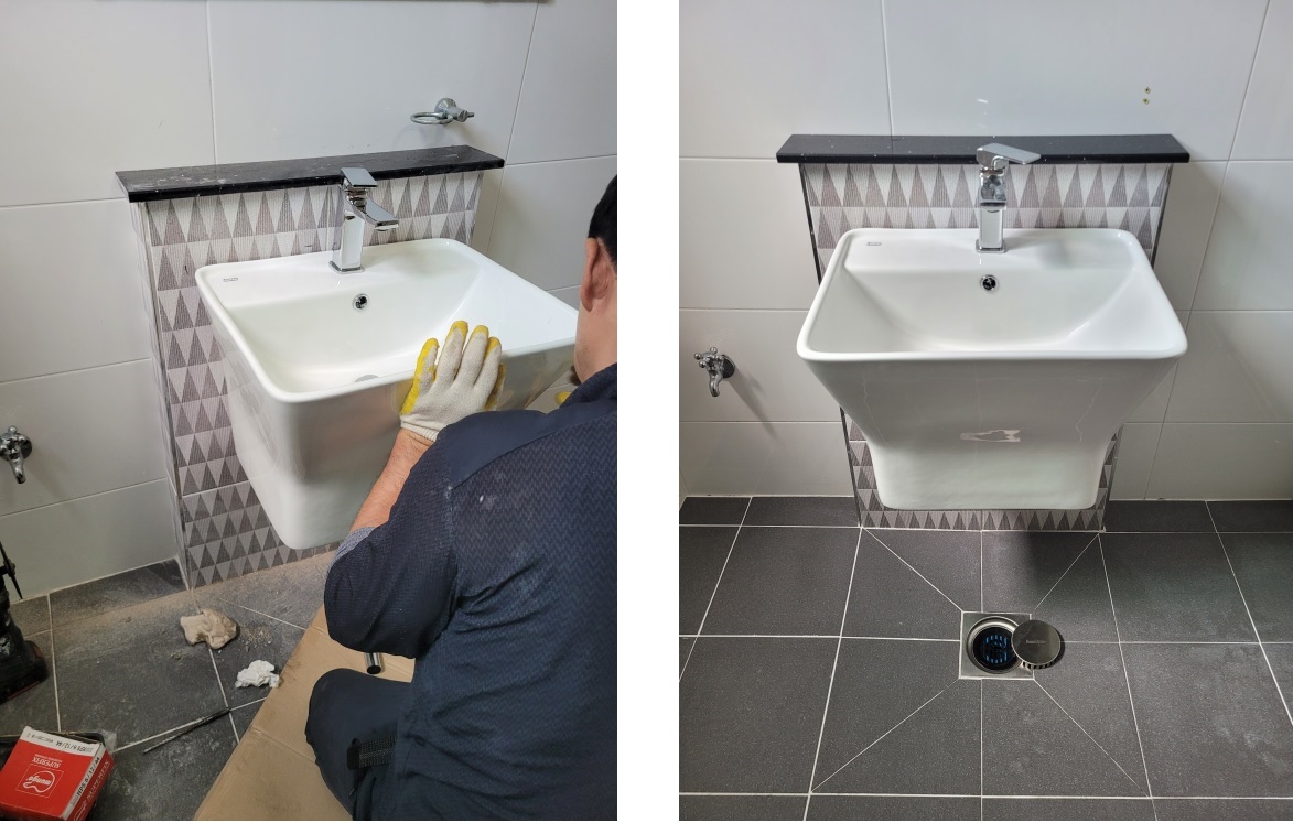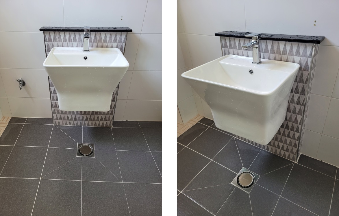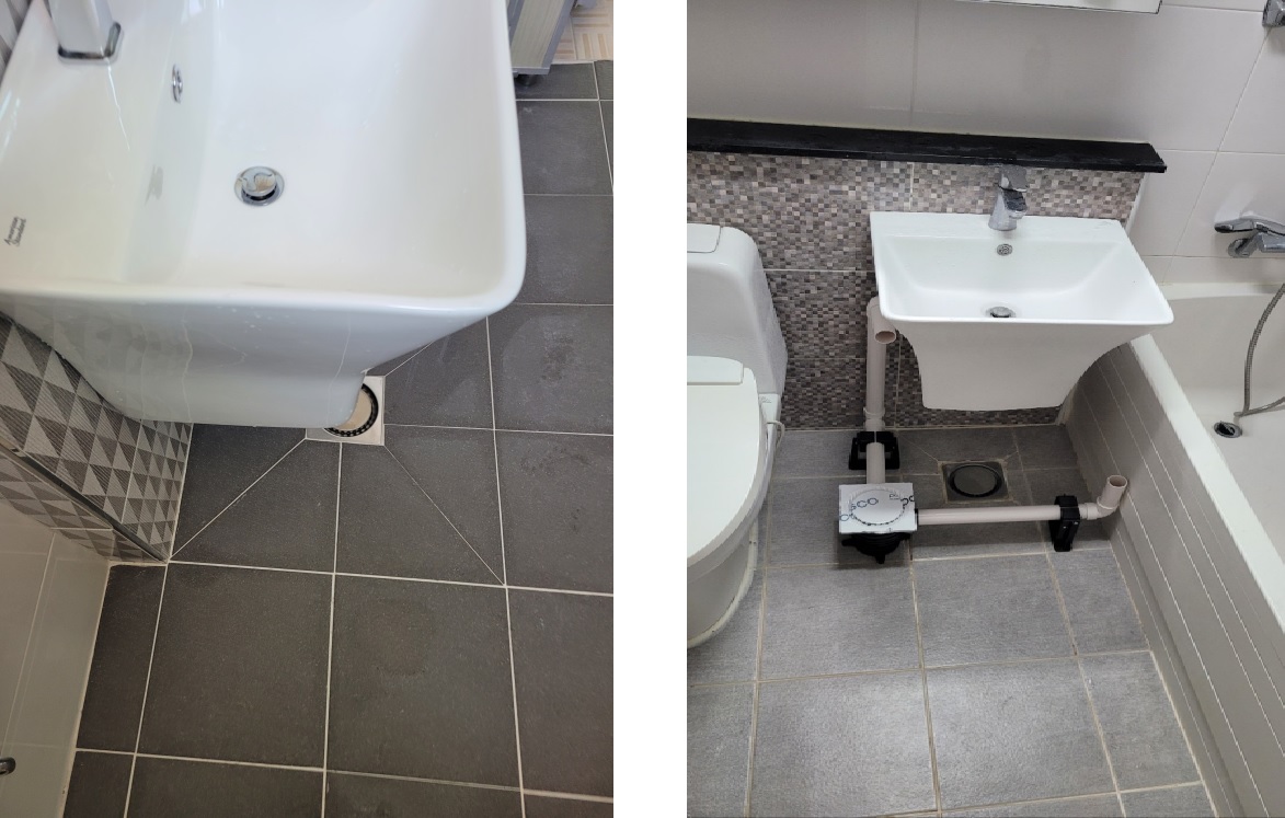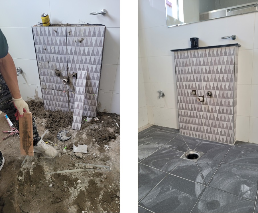 After pouring concrete and waterproofing the second time, the area above the dotted line is finished with tiles including drain.