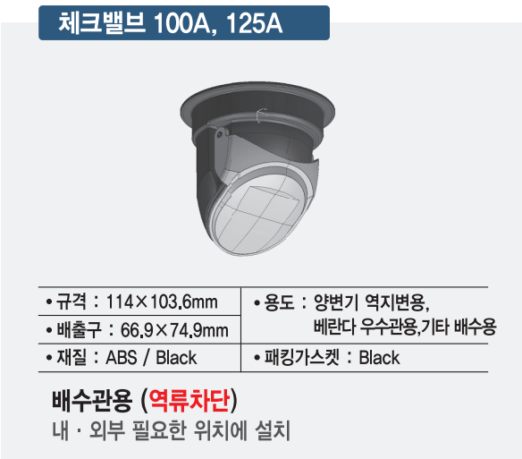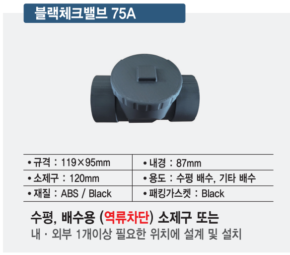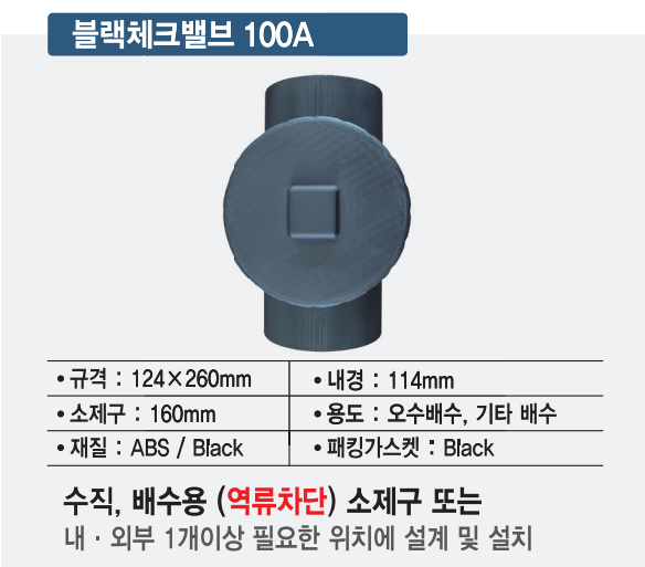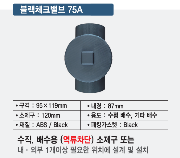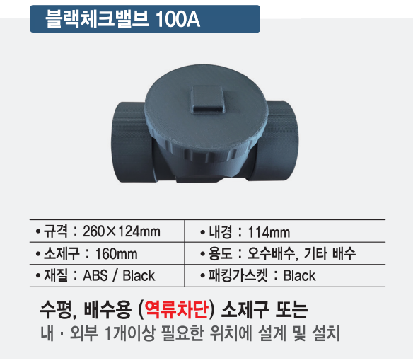 블랙체크밸브는 위생설비 배수, 통기 설계공사시에 배수시스템에서 발생하는 양압 또는 음압과 배수통기시스템의 부적합한 설계, 공사때에 발생하는 유압펌프 현상은 아래층 욕실, 변기 또는 배수구에서 물을 통하여 양압을 밀어내는 현상을 발생시킵니다.