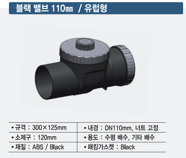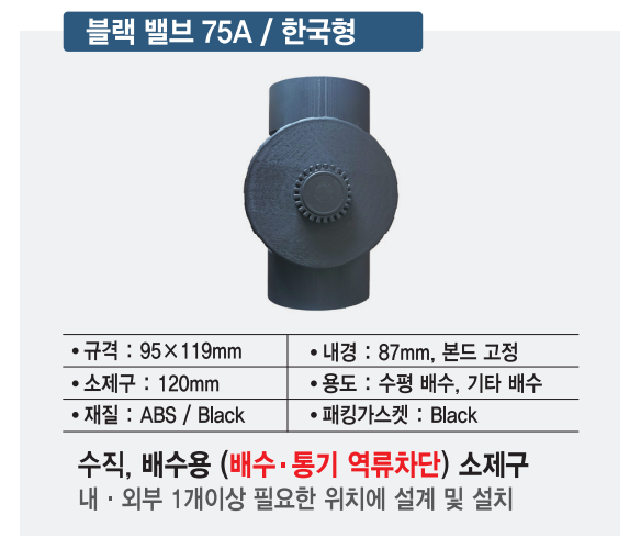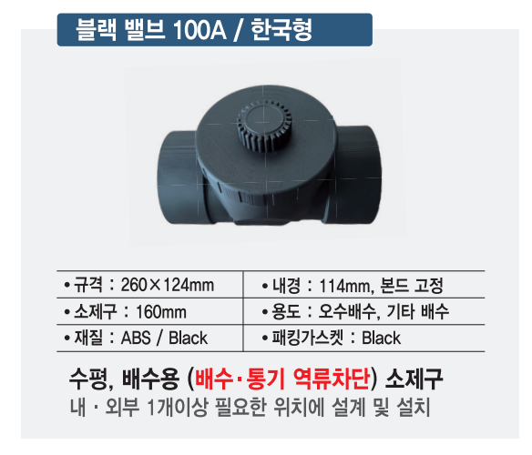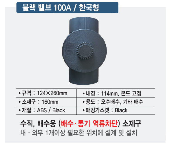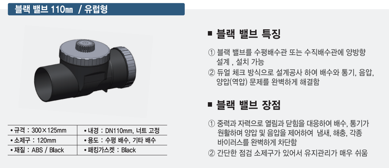 블랙밸브는 배수, 통기 시스템에서 배수와 통기가 자동 상호연동되어 배수시에 공기가 즉각 도미노식으로 열리어 원활한 배수후에 즉시 닫히므로 블랙밸브에서 냄새, 해충, 각종 바이러스를 방지하여 줍니다.