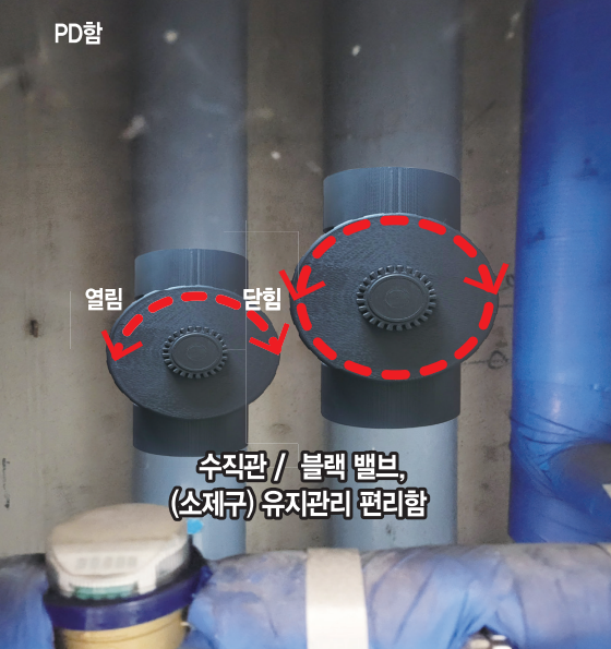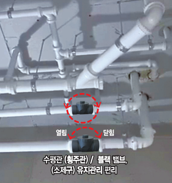 블랙밸브 적용, 설계, 공사하는 장점은 여러개의 각종 통기배관과 통기밸브를 대신하여 공기를 직접 공급하여 변기, 욕실바닥, 세면대, 욕조, 위생기구에 물이 빨려 내려가는 음압, 각종 사이펀으로 인한 봉수파괴와 물을 밀어내는 양압(역압) 문제를 쉽게 해결하는 경제적 공법입니다.