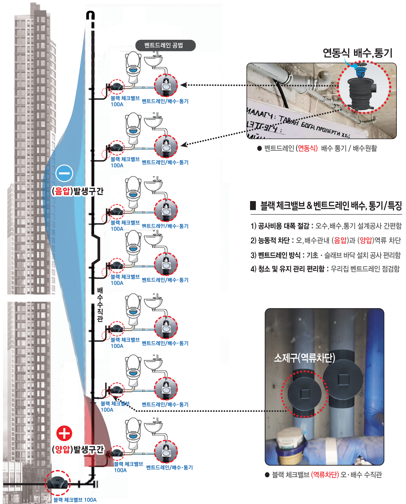 블랙체크밸브는 & 벤트드레인 시스템은 2개의 배수관 또는 1개의 배수관으로 선택, 변기, 세면기, 욕실바닥, 배수, 통기하여 음압과 양압의 문제점을 설계 및 공사하여 해결합니다.