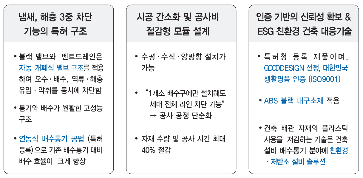 블랙 밸브와 벤트드레인은 아파트, 오피스텔, 호텔, 모텔, 빌라, 단독주택, 모든 건축에 위생설비 시스템의 배수, 통기 상호연동식 공법으로 압력균형을 이루어 배수와 통기가 원활하고 냄새 및 해충, 각종 바이러스를 차단하여 위생환경을 유지하는 핵심 설비 솔루션을 제공합니다.