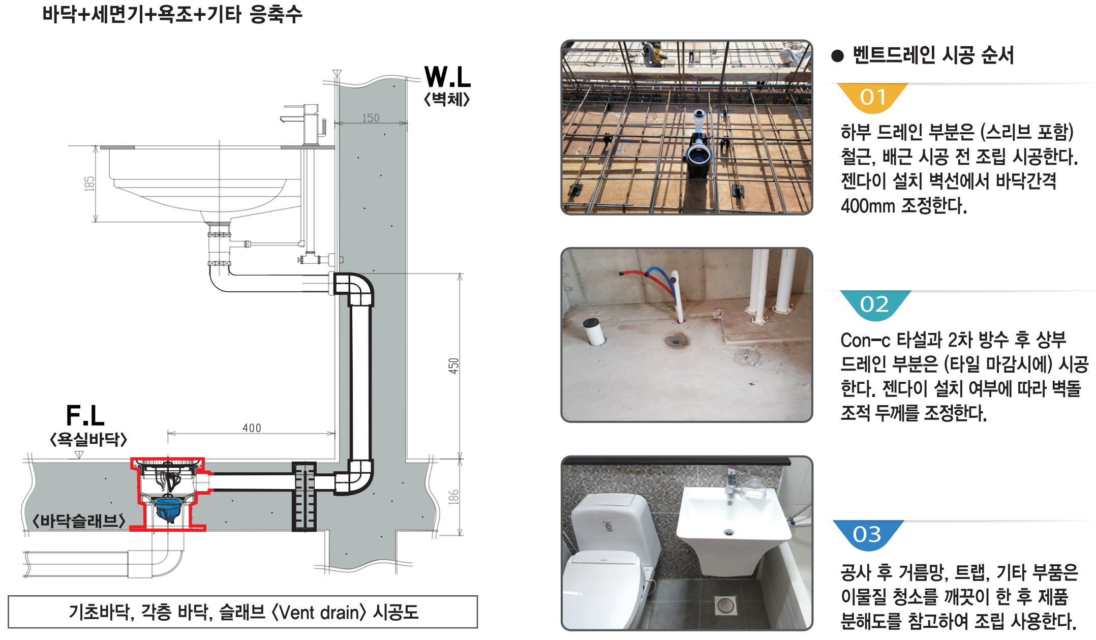 벤트드레인은 배수, 통기시스템의 배수와 공기를 직접유입하는 다기능 드레인입니다.