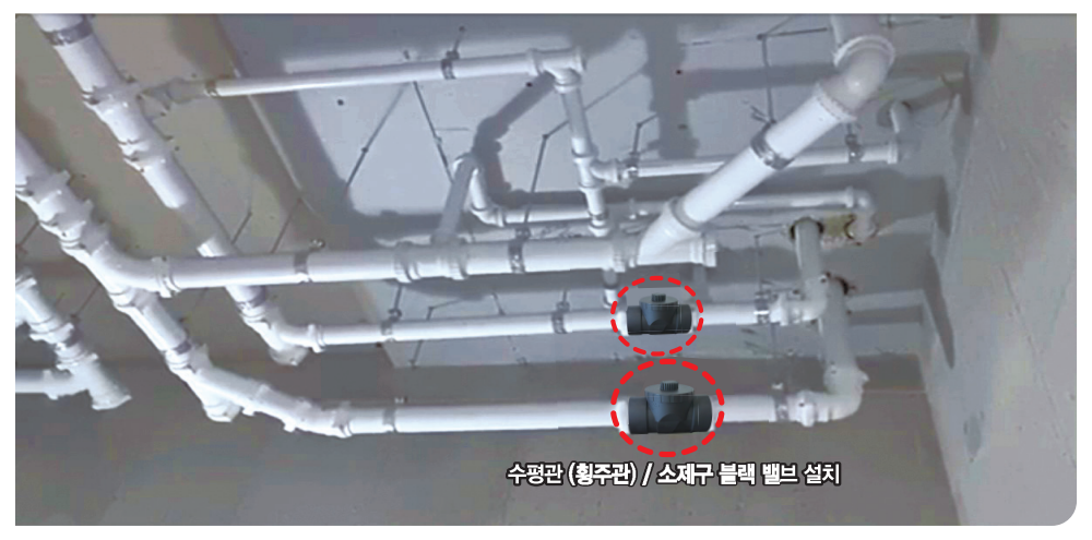 - ● 블랙 밸브 75A, 100A 수평관 또는 수직관 (배수,통기, 역류차단) / 오▪배수관에 1개이상 편리한 위치에 셜계 및 설치한다.