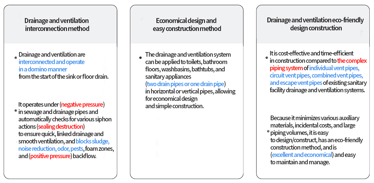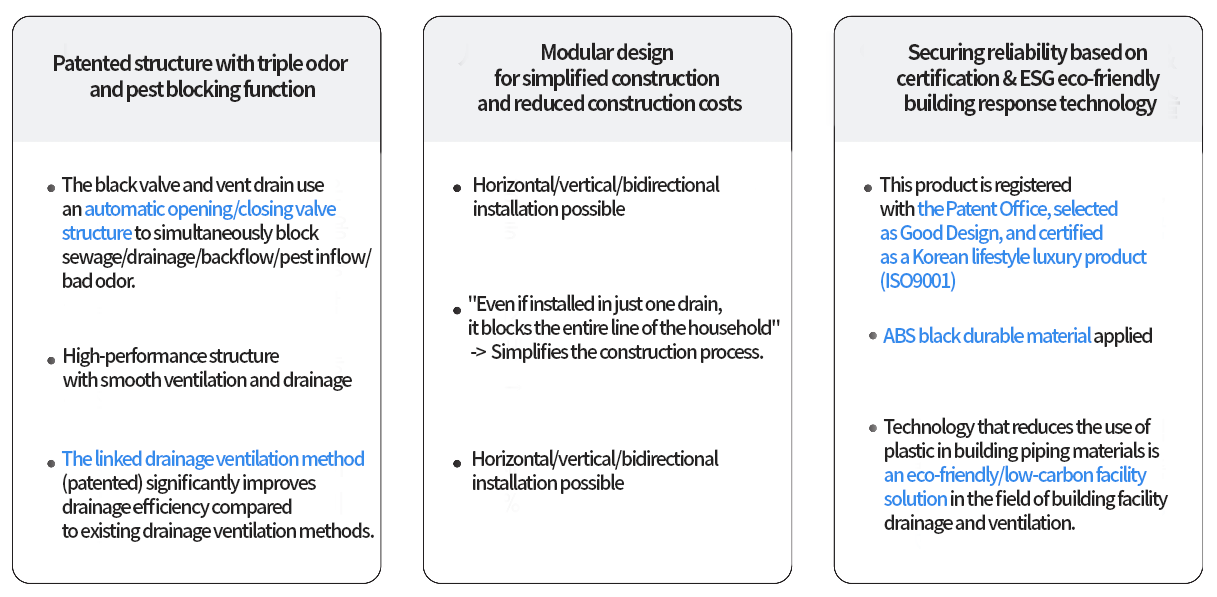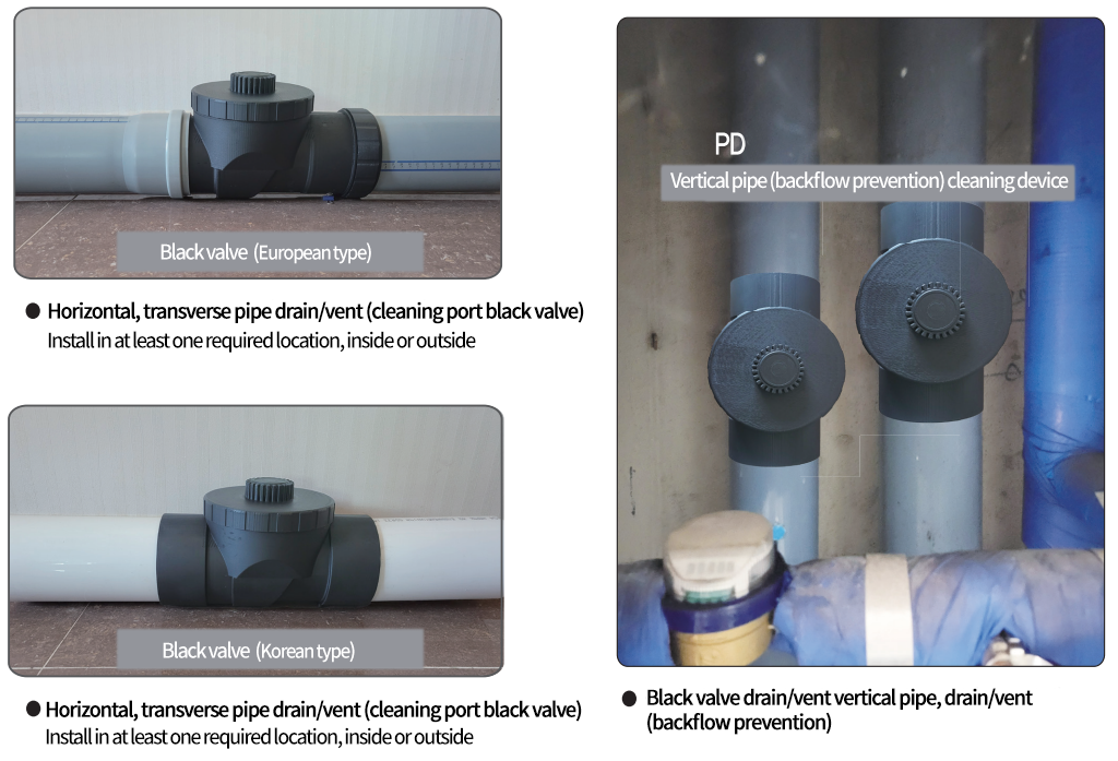 Black valves and vent drains are a perfect solution for sanitary facilities in apartments, officetels, hotels, motels, villas, single-family homes, and other large-scale residential and commercial buildings, providing smooth drainage and ventilation while blocking odors, pests, and various viruses.